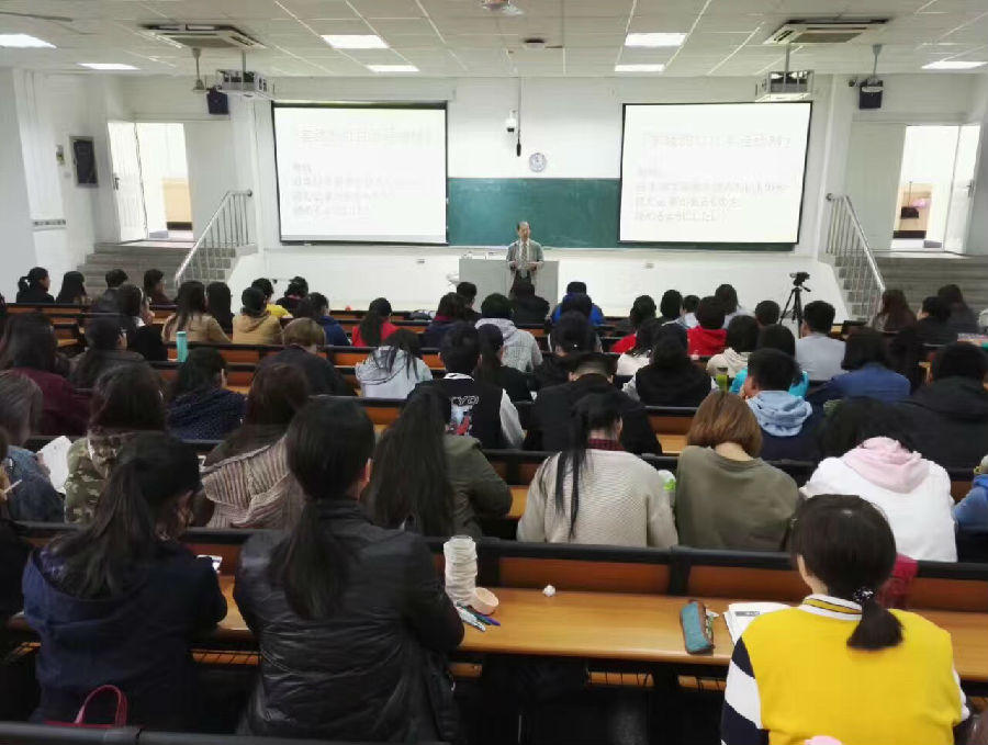4月7日上午的讲座题为「日语阅读理解实践—以网站阅读为例(実践的な日本語読解—インターネットのクチコミュニケーションを例にして)」。容纳近300人的阶梯教室C201座无虚席。野田教授以日本的几大美食网站上的评论文为研究文本,列举若干实际例词、例文,生动阐释了如何编写出运用日本人实际使用的“活日语”的阅读教材。野田教授指出,首先需要分析调查文章类型、文本中使用的表现形式以及学习者的阅读困难点。野田老师接着又对文本的书写、表达方式、构成及特点进行举例分析;最后,野田教授指出,应该基于上述内容编写灵活日语读解教材。