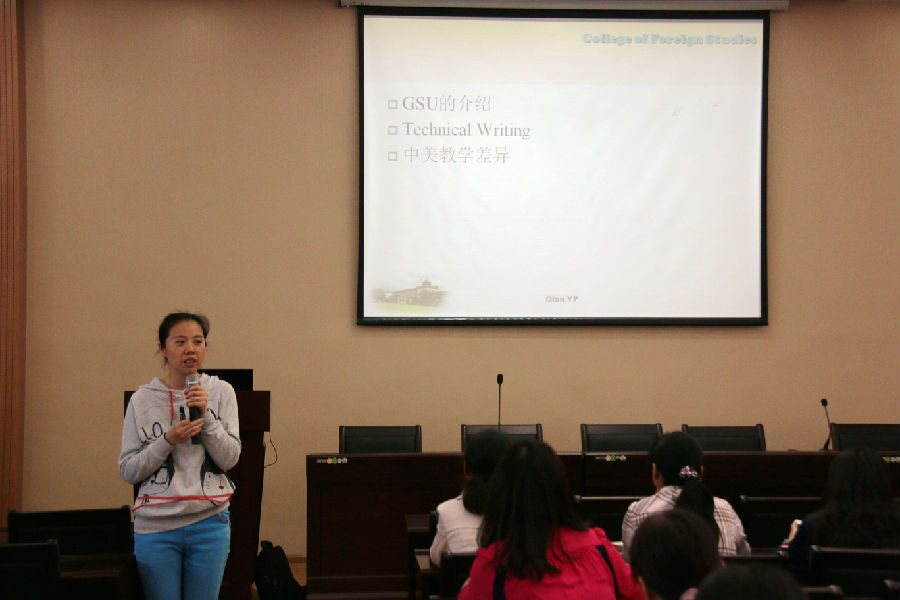 报告中,钱叶萍介绍了美国佐治亚州立大学在美国的地位和办学特色,以及该校英语系的课程建设、专业设置、培养过程等基本情况。针对该校英语系的特色方向《技术文本写作》,钱老师以选修的“Technical Communication”、“Digital Media Studies”和“Rhetoric of Digital Media”三门课程为例,从课程内容、研究方向和研究方法等方面详细陈述了《技术文本写作》研究和服务的范围和对象,方法和工具等。“技术文本写作”在我国仍属新兴应用语言学科方向,在培养语言服务人才方面具有广阔的发展前景。最后,钱老师根据自身半年的切身体会,从教师的视角分析了中美大学课堂的异同。