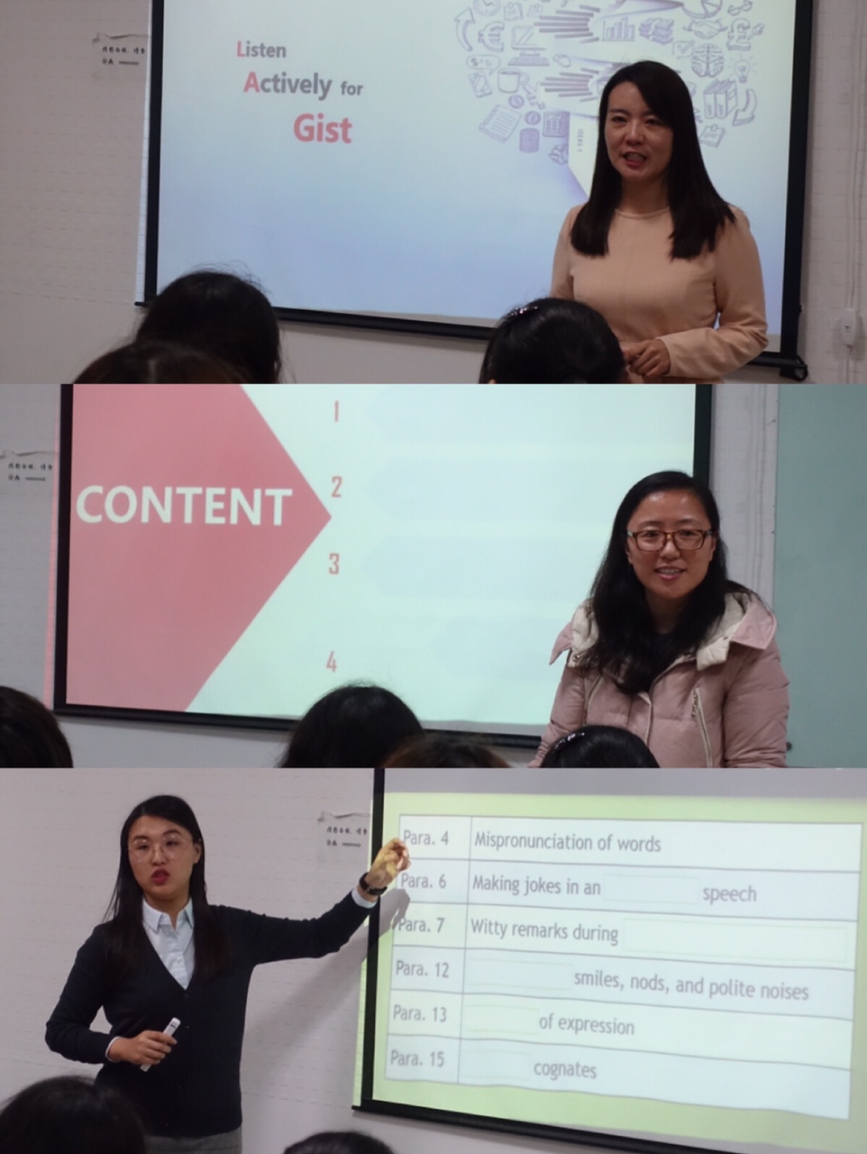 在胡苑艳老师说明备课流程之后,三位参赛老师分别按照20分钟讲课、专家提问、10分钟说课、专家提问、评委专家点评的环节进行了个人呈现。庄晓敏老师流畅的语言、地道的英式发音,王妍老师引导学生时的循循善诱,霍雨佳老师纯正的语音和幽默风趣的教学风格给评委专家留下了深刻印象。评委专家分别对三位老师的讲课和说课作了精彩点评,一针见血地指出了她们教学环节中存在的问题,并提供了解决问题的思路和方向。