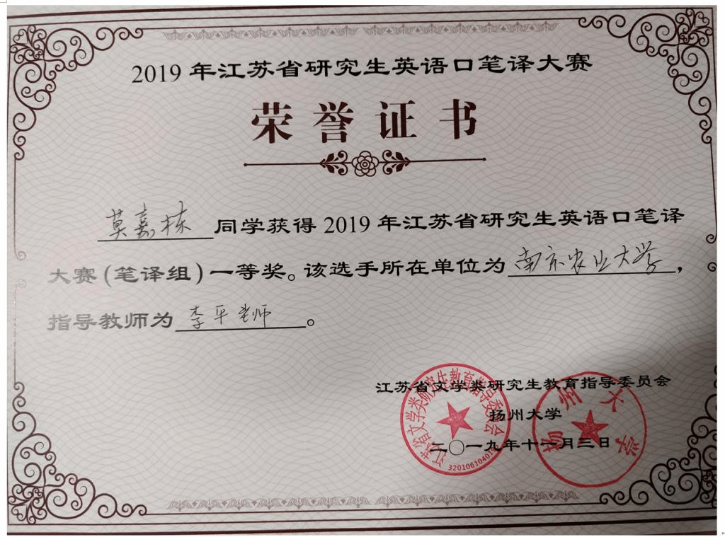 为在这次研究生翻译比拼中获得好成绩,金沙官网通过选拔,派出莫嘉栋、陈丹仪参加笔译赛事,邓玉萍、刘国豪参加口译赛事。赛前,李平老师、霍雨佳老师分别对四位同学进行了笔译和口译培训。通过现场角逐,四位同学不负众望,分别获得笔译一等奖、二等奖,口译三等奖、优胜奖,为我校争得了荣誉。尤其是莫嘉栋同学,在笔译赛事中以总成绩第一名获得一等奖(总成绩=汉译英成绩*50% +英译汉成绩*50%)。