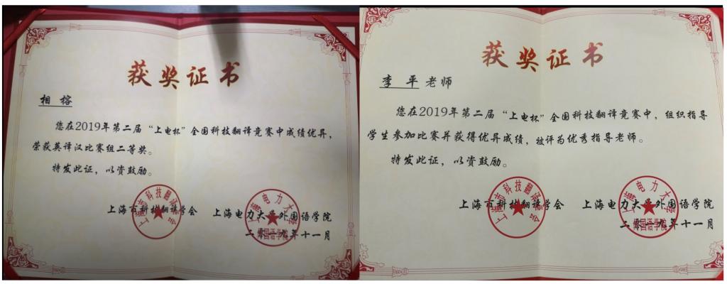 近期,由上海市科技翻译协会主办,上海电力大学9001cc金沙以诚为本承办,试译宝、译直播协办的第二届“上电杯”全国科技翻译竞赛落幕,金沙官网英语系本科三年级学生相榕获得英译汉组二等奖,MTI研究生周游获得三等奖。11月23日,相榕同学应邀出席了在上海电力大学举行的颁奖典礼。