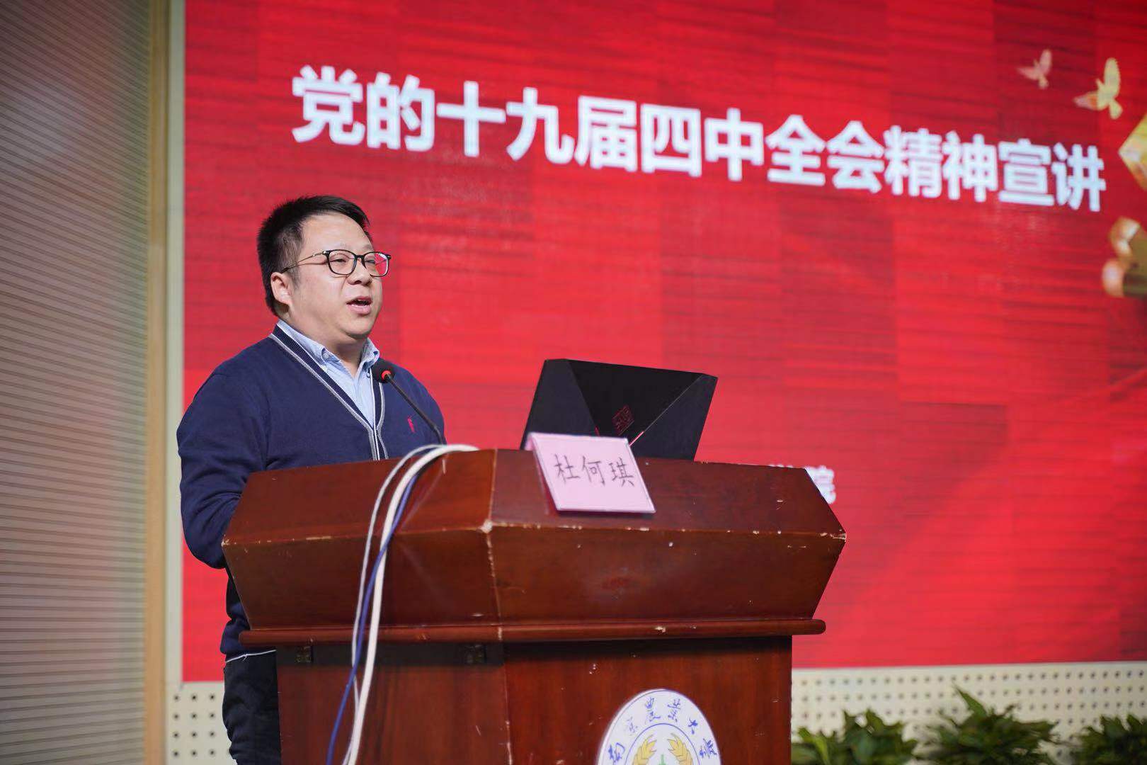 12月14日下午,金沙官网邀请了我校党的十九届四中全会精神宣讲团成员、马克思主义学院杜何琪老师为金沙官网在大学生活动中心为卫岗校区大二、大三、大四年级本科学生,研究生,教职工及退休教职工进行了集中宣讲。23日晚,金沙官网邀请了我校党的十九届四中全会精神宣讲团成员、马克思主义学院吴国清老师为在汇贤楼C202为金沙官网浦口校区大一年级本科学生进行了集中宣讲。两位老师的宣讲报告紧紧围绕“坚持和完善中国特色社会主义制度、推进国家治理体系和治理能力现代化”这个主题,既全面系统又重点突出,既深刻严谨又深入浅出,既有理论高度又紧密结合实际,全面介绍了党的十九届四中全会的基本情况、重大意义、历史贡献、总体要求、总体目标及重点任务,深刻阐释了中国特色社会主义制度和国家治理体系的显著优势,对金沙官网师生认真学习党的十九届四中全会精神提供了有针对性的系统指导。