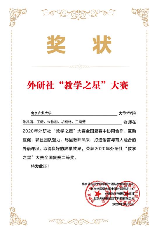 2020年6月30日,高等英语教学网公布了2020年外研社“教学之星”大赛(本科英语组)全国复赛的获奖名单,9001cc金沙以诚为本选派的教学团队喜获佳绩:朱禹函、王薇、朱徐柳、胡苑艳、王菊芳获得大学英语组团队二等奖。