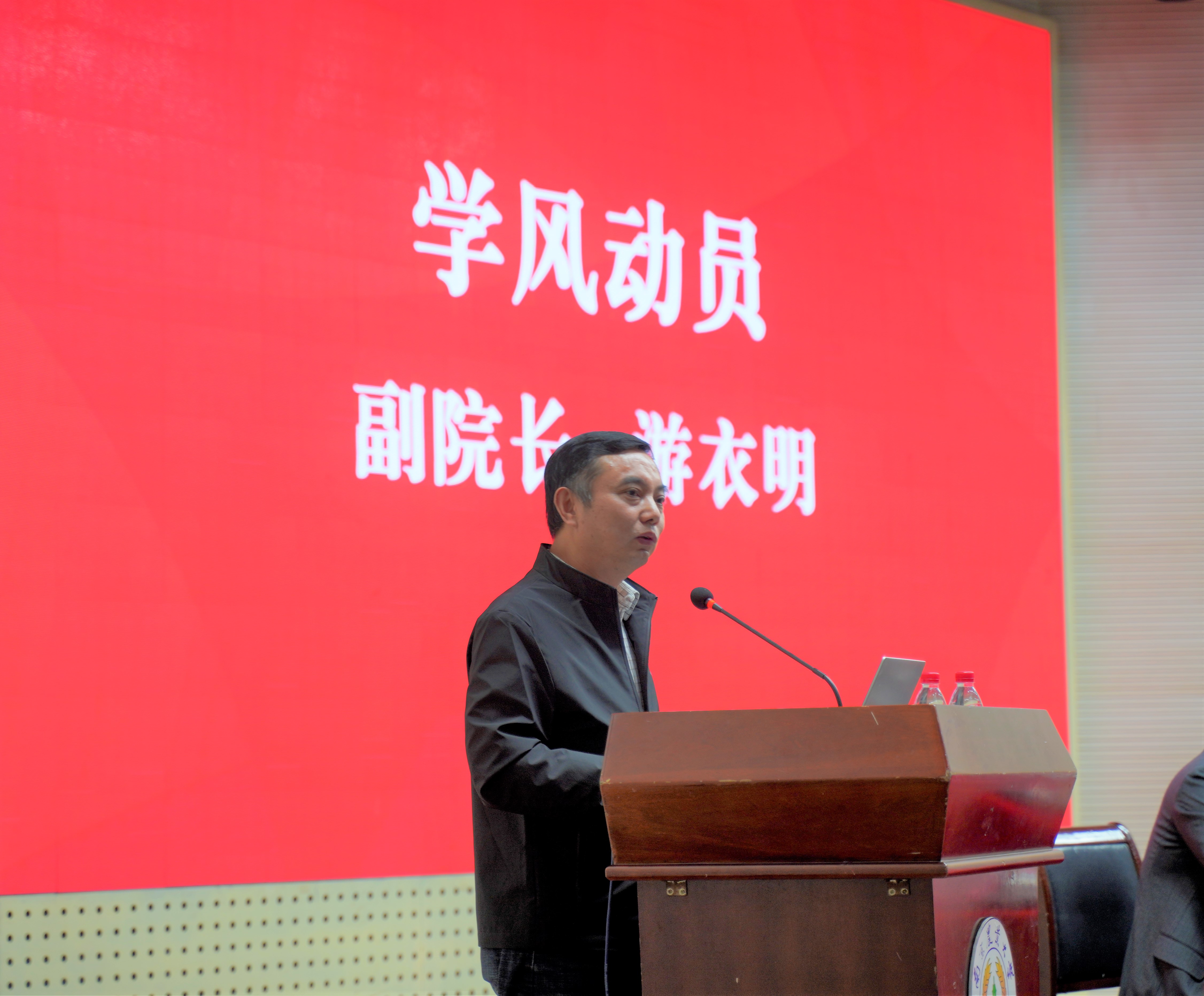 游衣明作学风动员发言。他期望全体新生要争做品行高尚、理想远大、独立创新、踏实肯干、言行规范的人。越努力,越幸运。他鼓励新生要加强科学文化知识的学习,要不畏艰险,咬定青山不放松,在信息良莠不齐的时代中明辨是非,在时代的洪流中积蓄破土的力量。
