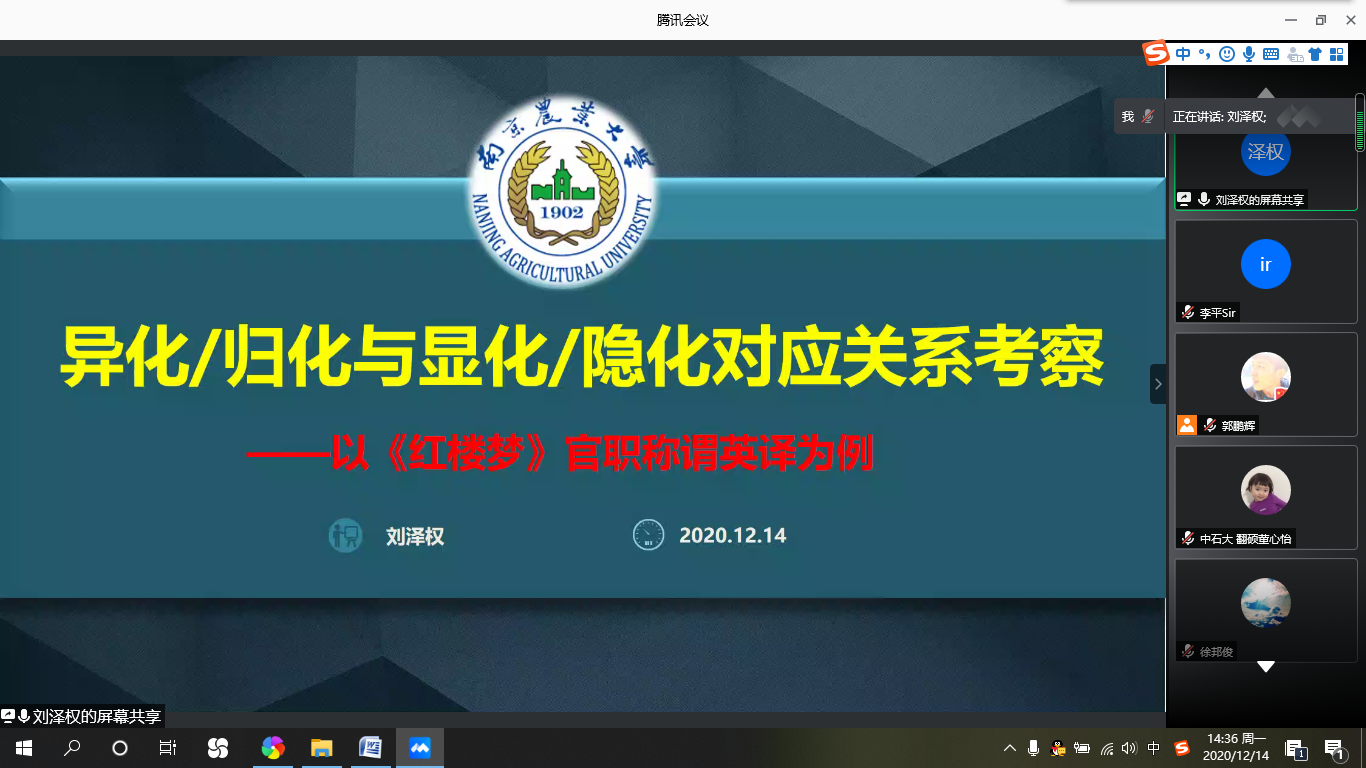 12月14日下午2点30分,河南大学9001cc金沙以诚为本刘泽权教授应9001cc金沙以诚为本邀请,通过腾讯会议平台为金沙官网师生做了一场题为“异化/归化与显化/隐化对应关系考察——以《红楼梦》官职称谓英译为例”的专题讲座。此次讲座由9001cc金沙以诚为本李平教授主持,金沙官网部分师生以及来自全国多所高校的近300位学者参加了本次学术讲座。