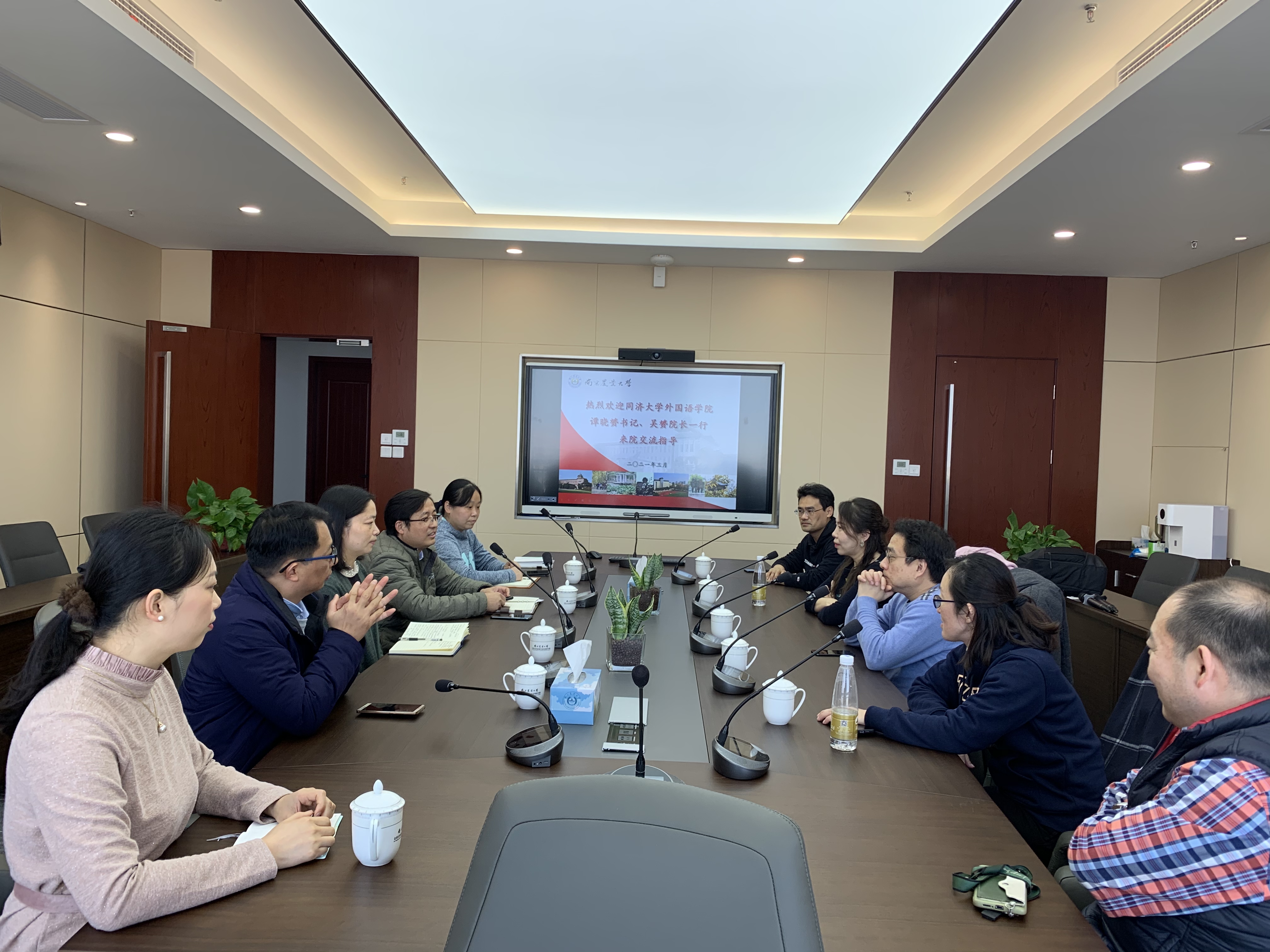 吴赟从发展思路、学科布局、师资建设、课程思政、科研团队建设等方面介绍了同济大学9001cc金沙以诚为本的发展情况,并就如何以国家战略和社会需求为目标,对标新时代外语学科改革发展新需求,运用系统化思维,突出问题导向和交叉创新,实现教学、科研、实践的一体化发展阐述了自己的理解。谭晓赟就新时代9001cc金沙以诚为本如何立足自身基础,借力学校优势平台,拓宽科研思路,找准主攻方向,服务学校国际化方面谈了自己的体会。双方老师们也分别就青年教师培养、科研方向凝练、人才培养理念、学院治理模式等方面进行了深入地交流和探讨。