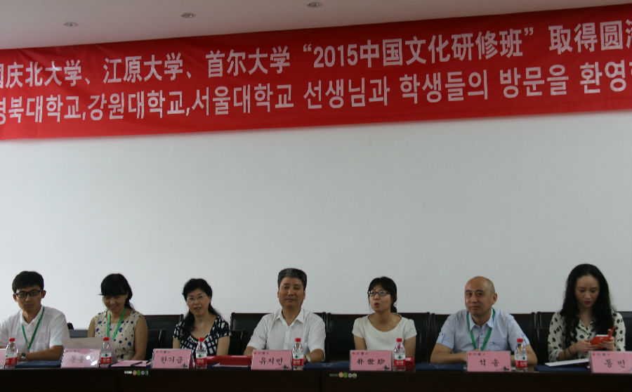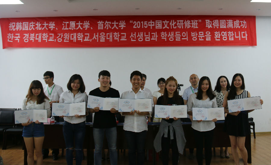 2015年7月22日下午两点,韩国庆北大学、首尔大学、江原大学“2015暑期研修班”结业典礼暨中韩学生联欢会在教学楼七楼报告厅举行。国际教育学院院长刘志民,9001cc金沙以诚为本党委书记韩纪琴,国际教育学院副院长石松,9001cc金沙以诚为本党委副书记董红梅,韩国带队老师朴世珍等出席活动。
